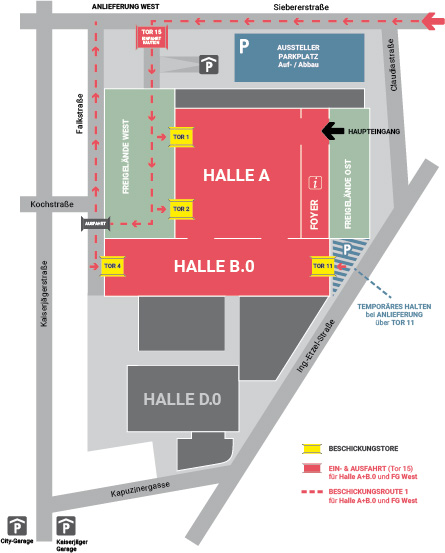 Halle A, Freigelände West: Anlieferung: ACHTUNG Einbahnsystem: Zufahrt Tor 15 über Siebererstraße, Ausfahrt Tor 13